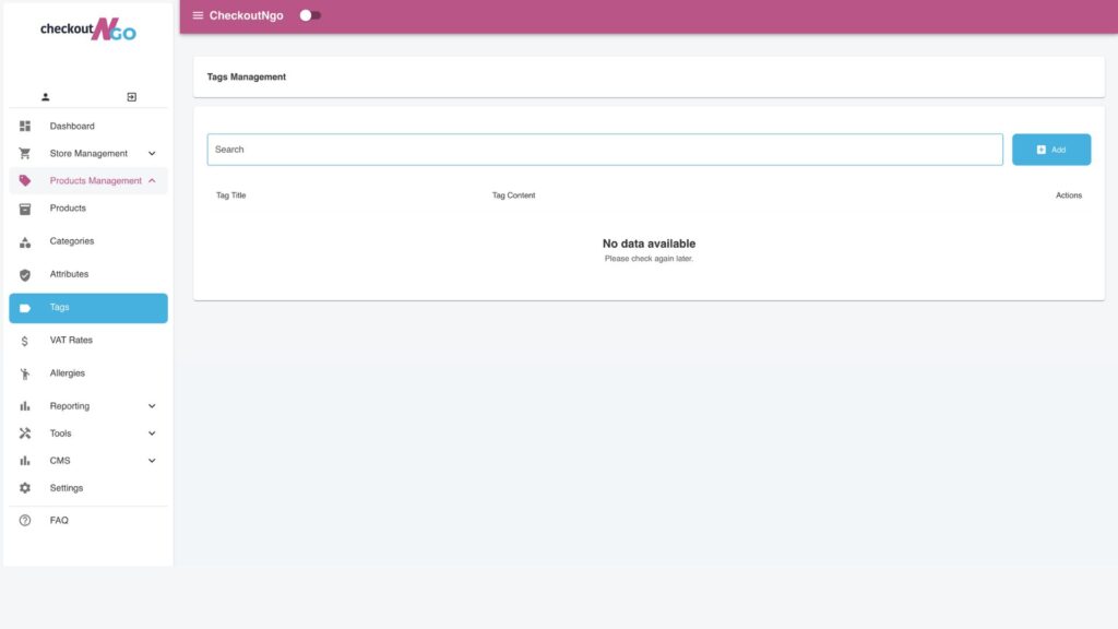 The Tags Management interface in CheckoutNgo provides a simple yet powerful way to add additional context or categorisation to your products.