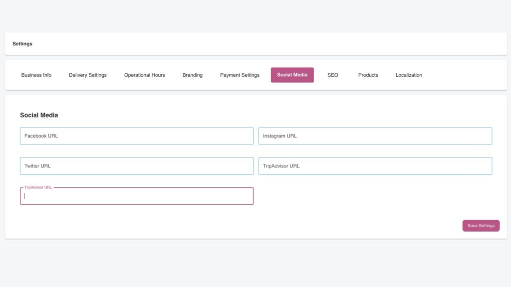 The Social Media settings page in CheckoutNgo allows you to integrate your store’s social media channels seamlessly. This section provides fields for linking your business’s Facebook, Instagram, Twitter, and TripAdvisor profiles. By entering the URLs for these platforms, you ensure that your store is fully connected to your social media presence.