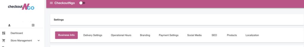 The Settings section of CheckoutNgo is your central hub for managing all aspects of your online business. From defining basic business details to configuring branding, operational hours, and payment settings, this feature empowers you with total control. Each tab in the Settings interface addresses a unique area of your operations, ensuring a streamlined and professional online presence tailored to your needs.
