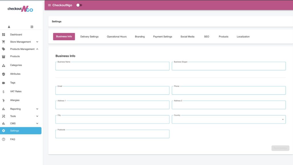 Let’s begin by exploring the Business Info tab, the first and most fundamental step in setting up your CheckoutNgo system.